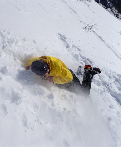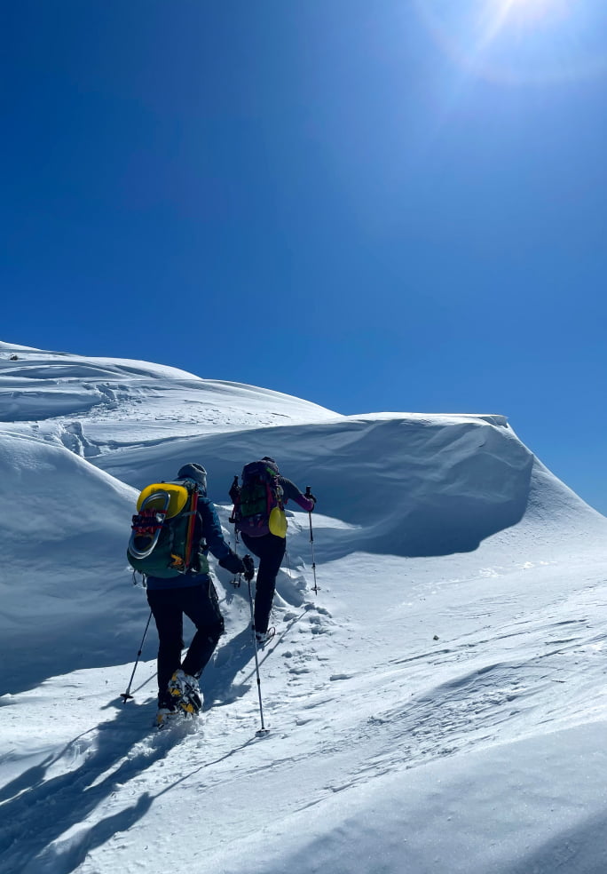 雪上歩行やギアの使い方など、雪山登山の技術を雪山で実践します。別日に雪山でテントでの衣食住も実践します。